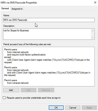 Permit Users from internet network and require multi-factor authentication except with Client User Agent claim regex matches (?i)Lync|"(?i)ACOMO|(?i)skype in the request Permit Users from internet network and with Client User Agent claim regex matches (?i)Lync|"(?i)ACOMO|(?i)skype in the request Permit Users from intranet network